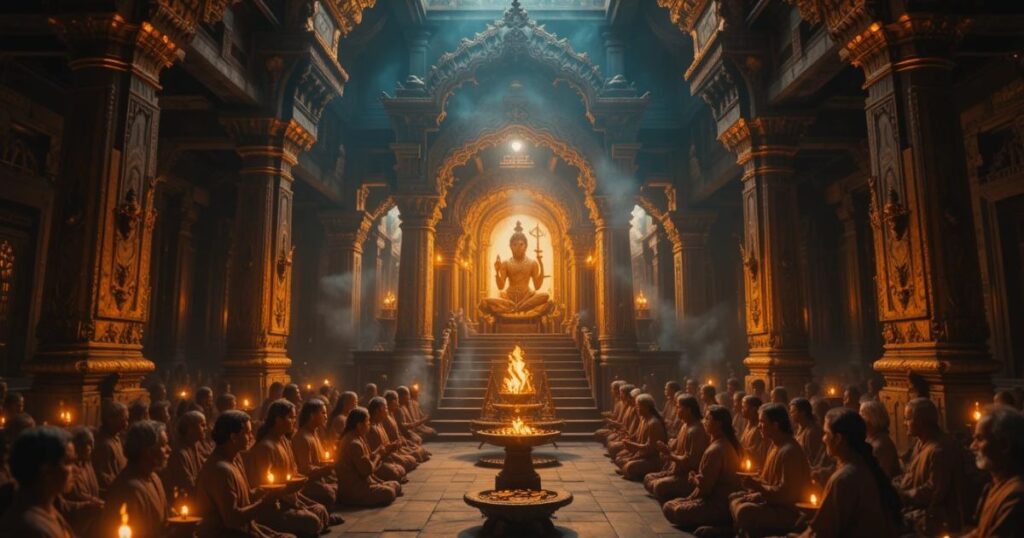 - Devotional chants and temple bells create a deep spiritual mood